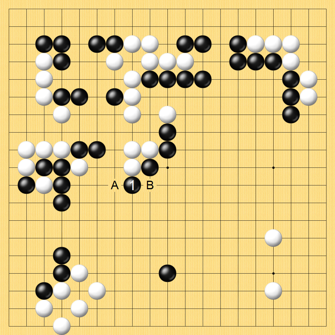 장면도) 상중앙 백대마를 공격하기 위해 중앙에서 흑1 젖힌 장면입니다. 다음 백은 백A 젖혀나가는 행마가 좋을까요 아니면 백B 단수치고 흑이 이을 때 백A 단수치며 젖혀나가는 행마가 좋을까요?
