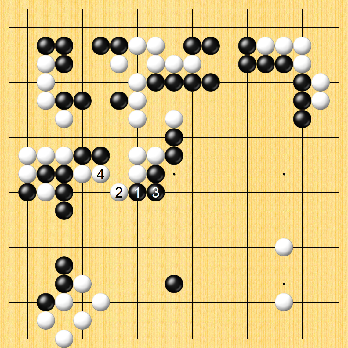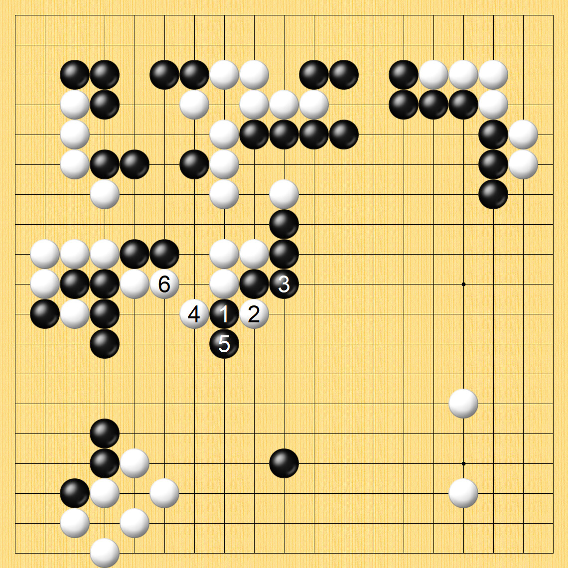 참고도1) 실전에서는 백2 단수치고 흑3 이은 다음 백4 단수치고 흑5 나갈 때 백6 호구이음 했는데 흑3으로 이은 흑의 모양이 두텁고 좋아 백의 실패입니다. AI는 본도의 모양이 해설도의 모양보다 3집 정도 나쁘다고 합니다.