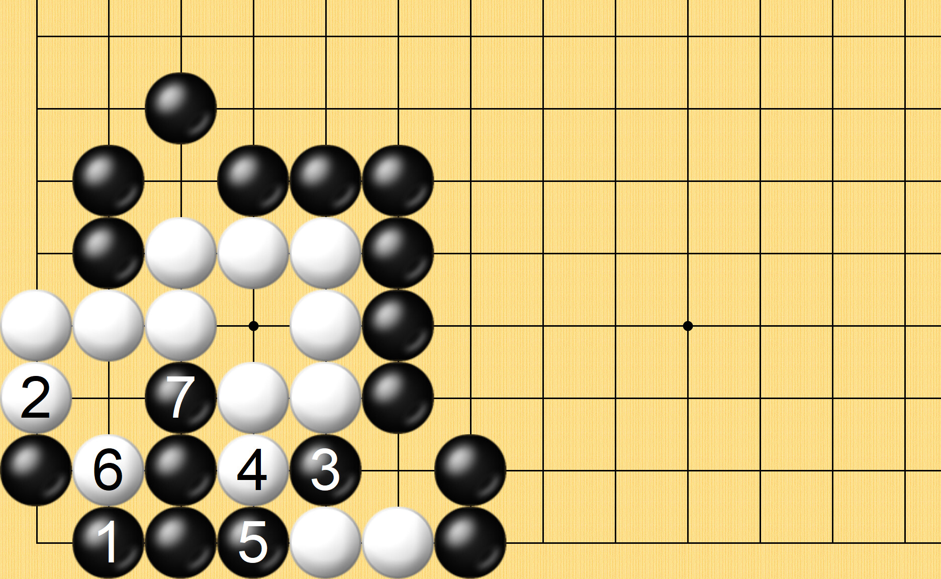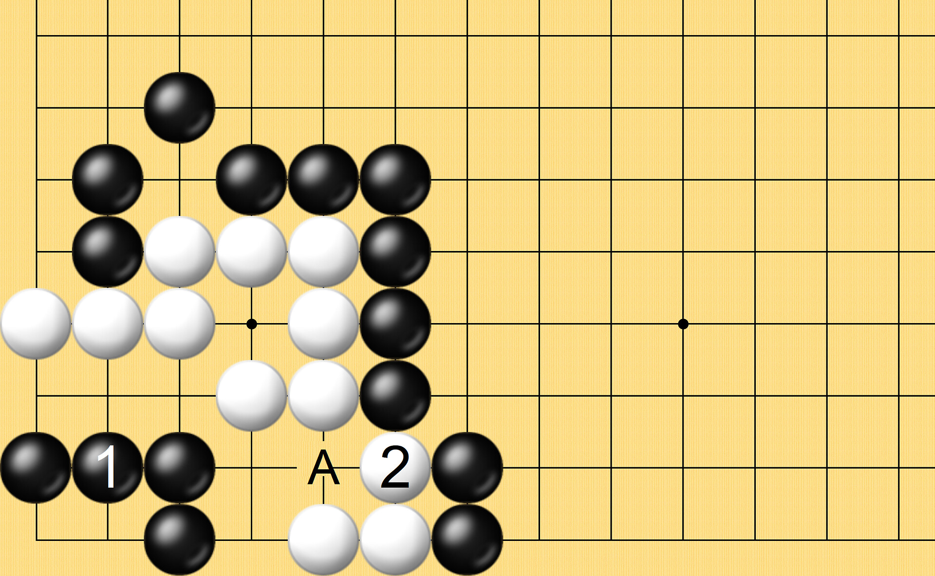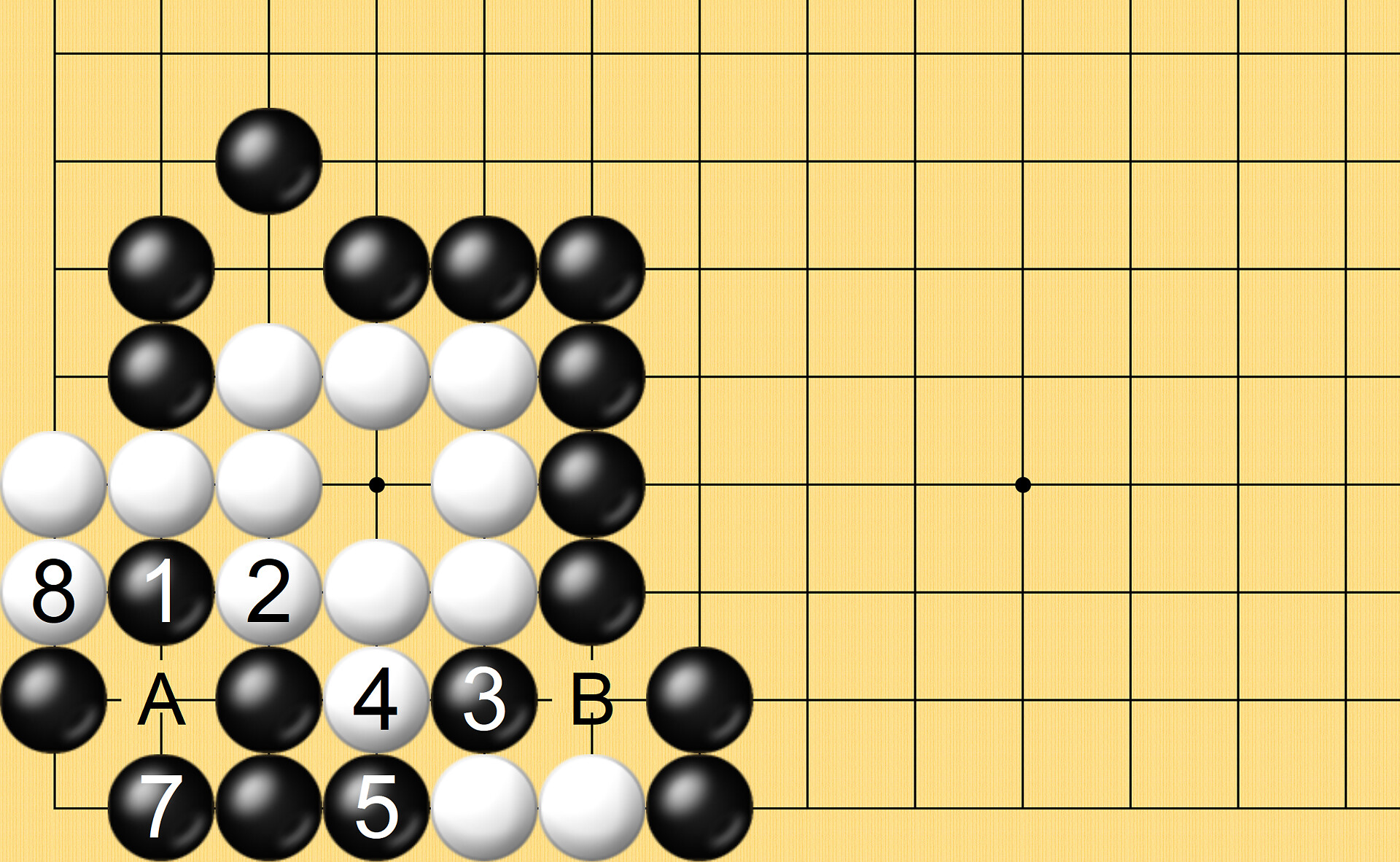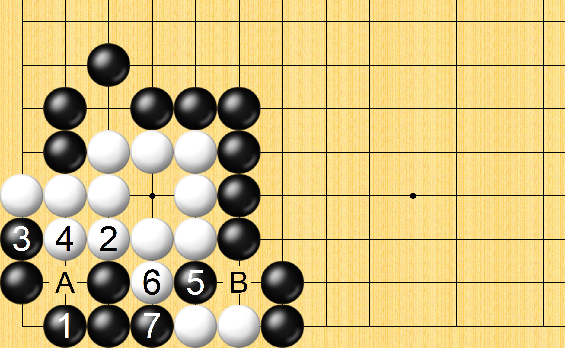 해설) 흑1이 급소이며, 백2가 최선의 응수이고 흑3이 또한 멋진 급소로 이하 흑7 단수쳐 다음 백A 단수쳐봐도 흑B로 백돌 2점을 따내고 다음 백이 흑돌 2점을 따내봐도 흑이 백돌 1점을 되따내 파호해 백돌이 잡힙니다.