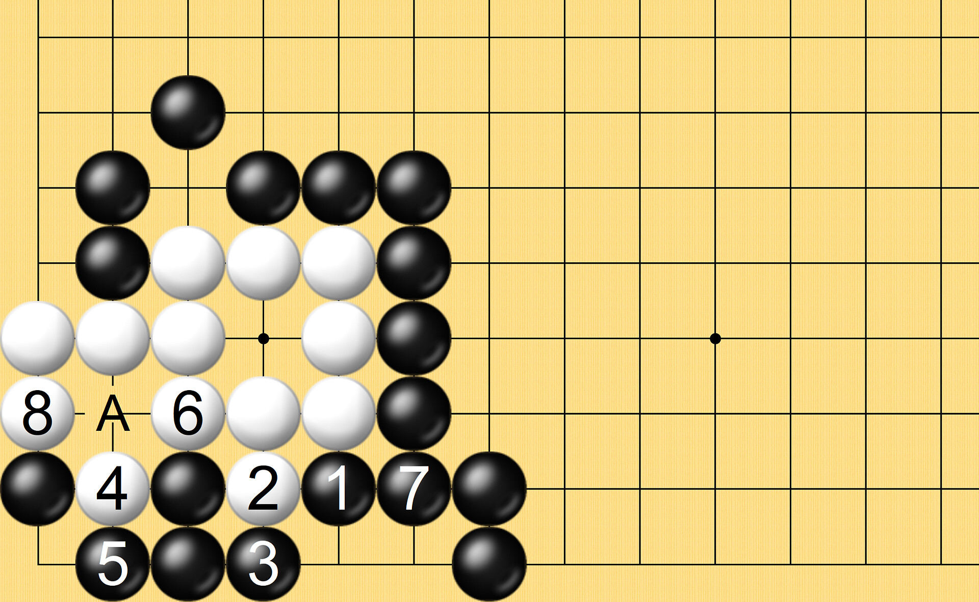 참고도3) 흑이 그냥 흑1 끼워 흑3으로 백돌 2점을 단수친다면 백4 끼움이 급소이고 흑5 단수칠 때 백6 단수치고 다음 흑7로 백돌 2점을 따낼 때 백8로 단수치고 흑A 따내면서 패가 됩니다.